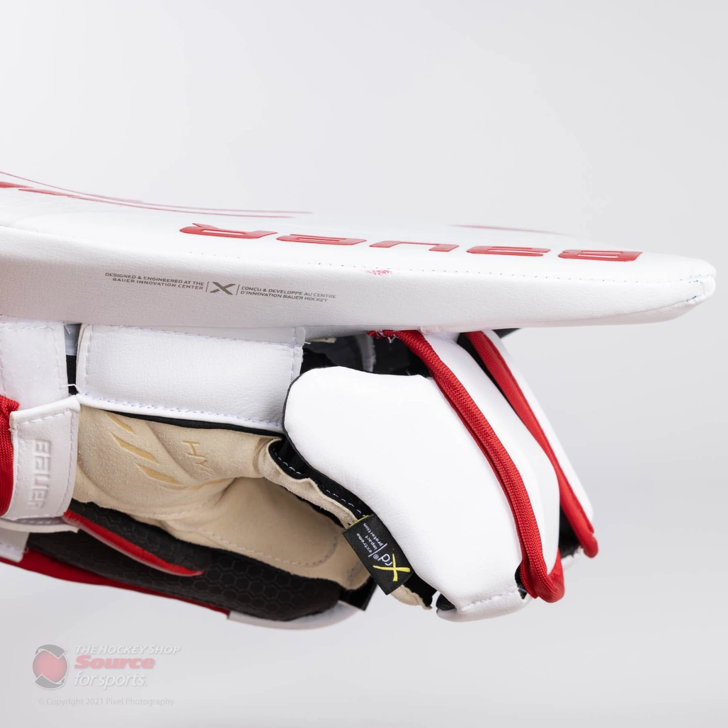 The palm of the Hyperlite is Bauer’s 14.5” Connekt+ technology. The 14.5” palm is a slightly shrunk down size reducing excess material to create a more snug fit. Connekt+ is the same material found in the 2X Pro player gloves; it’s a super soft, supple and yet durable material that gives the Hyperlite blocker a rich, comfortable feel on the hand while enhancing the stick feel through the palm. The Hyperlite palm also has a thin layer of padding to help reduce any vibrations from stick saves.