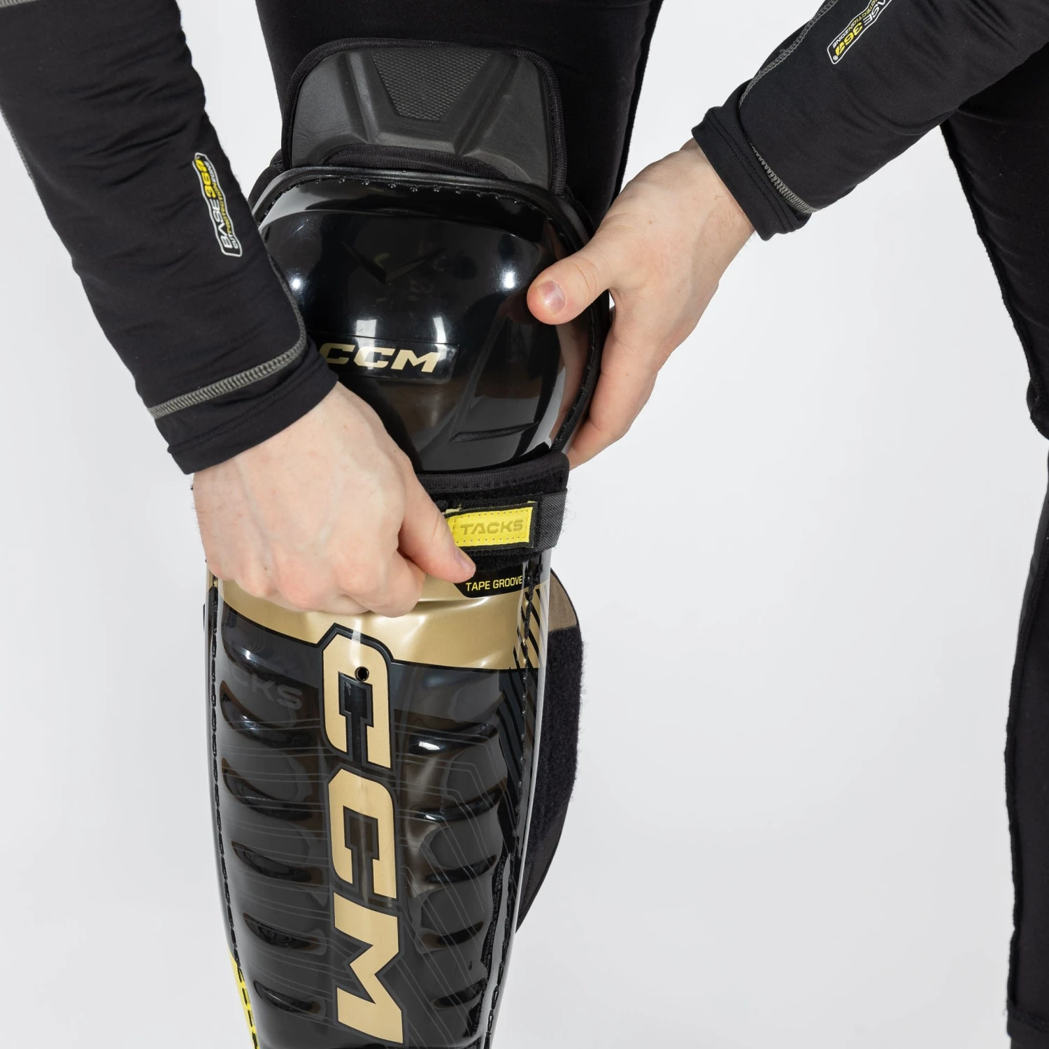 The shin cap has been made of tough PE plastic and engineered with an Anatomical Shield Design for max coverage and comfort. To combat wear and tear that tends to occur near the bottom of the pad, CCM also implemented an abrasion-resistant bottom pad, reinforced with D3O foam. The pad and D3O ensure not just more durability in that area, but also more security near your ankles. In addition, underneath the kneecap is a groove fit for your tape.