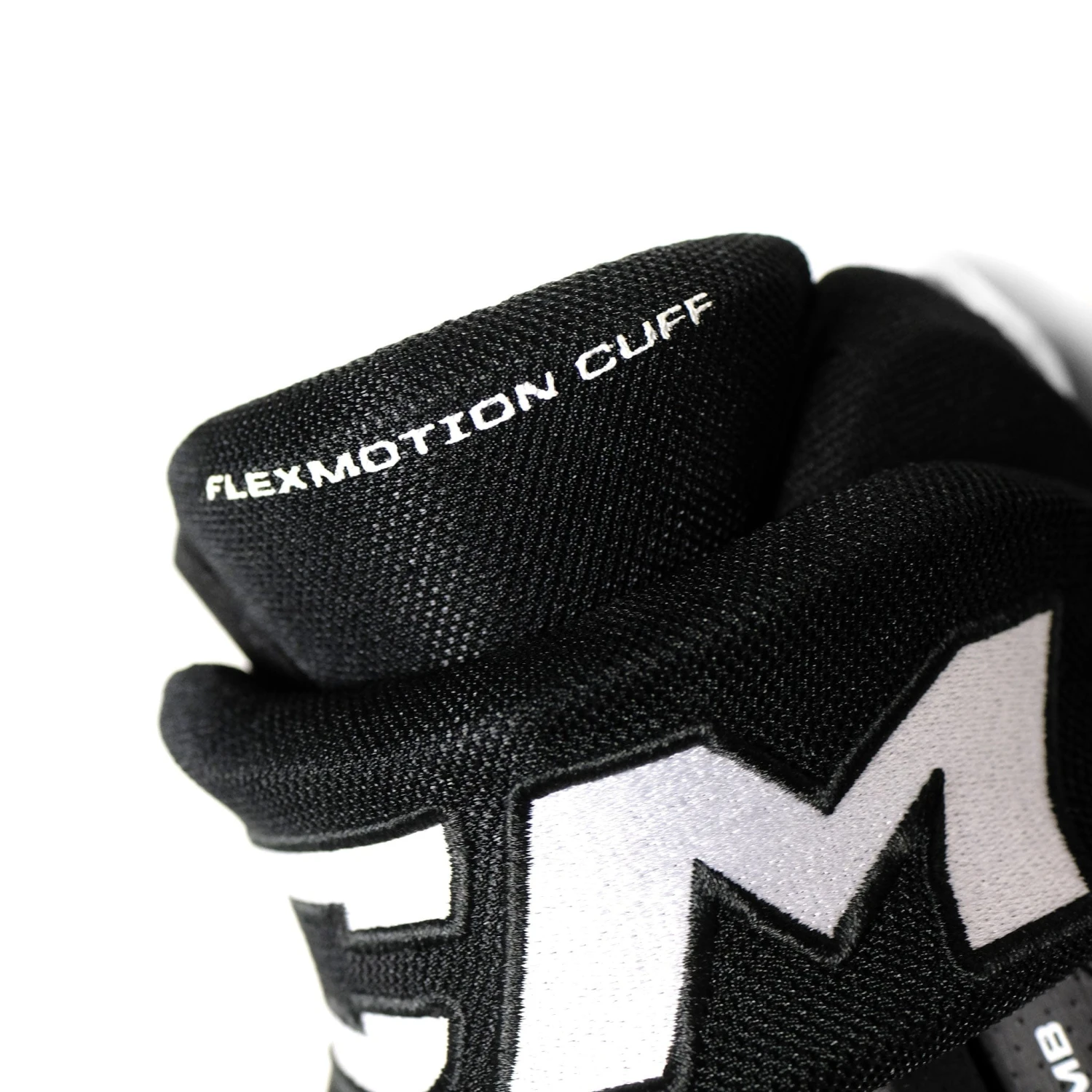 The cuff is sectioned into multiple parts: a FlexMotion Segmented open cuff on the outside and a Sublimated Liner inside cuff on the inside portion. The FlexMotion cuff is a five-piece, open anatomical cuff that has been shortened for a greater range of motion while stickhandling without sacrificing protection. The Sublimated Liner inside cuff functions as part of the liner and has a soft cushioning texture. Its antimicrobial properties will keep you feeling dry and fresh all game long.