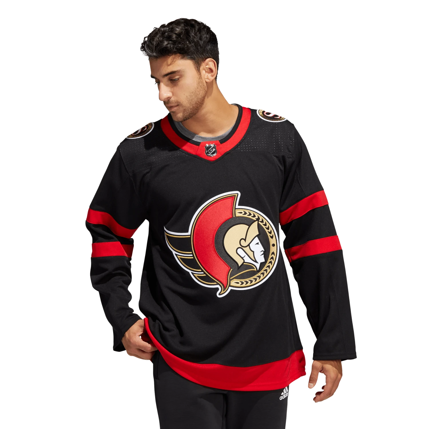 Pull on this adidas Ottawa Senators authentic home jersey, and get the gang together for game night in your fan cave. AEROREADY keeps you cool and dry as you wait for the puck to drop at center ice. The big crest out front, shoulder patches and a fight strap with a snap closure keep the look legit. This product is made with Primegreen, a series of high-performance recycled materials.