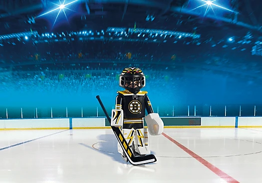 Back the net with the NHL™ Boston Bruins™ Goalie. Set includes 1 Boston goalie, 1 stick, 1 puck, helmet with visor, goalkeeper glove, and 1 arm cuff.