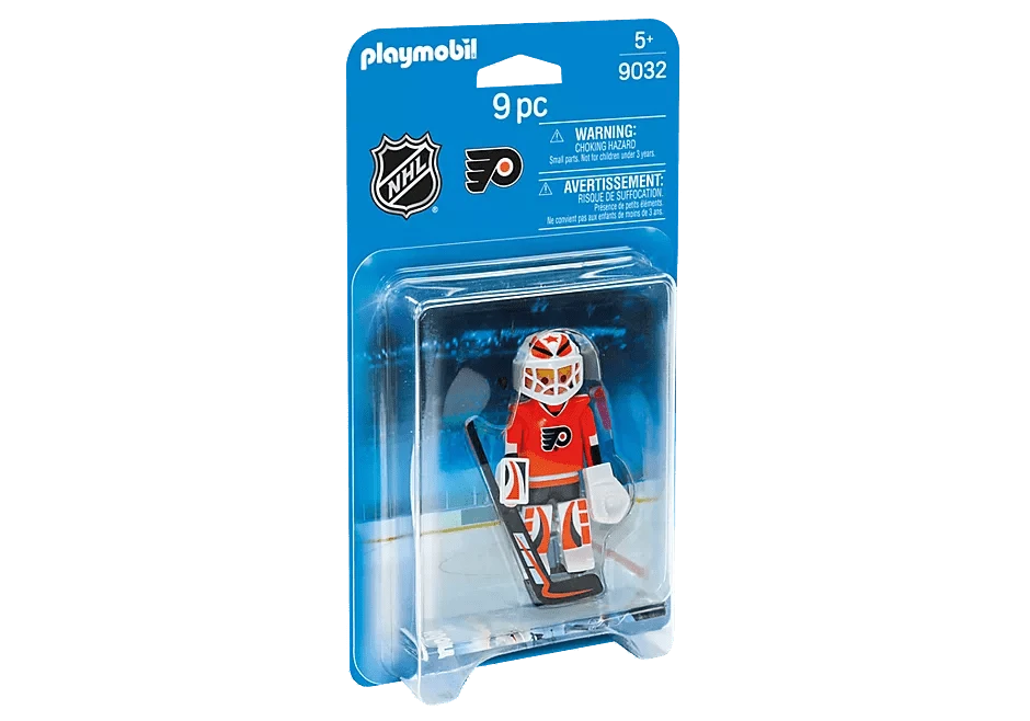 Back the net with the NHL™ Philadelphia Flyers™ Goalie. Set includes 1 Philadelphia goalie, 1 stick, 1 puck, helmet with visor, goalkeeper glove, and 1 arm cuff.