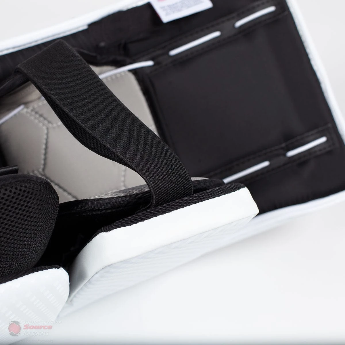 The knee cradle of the Vaughn SLR 2 keeps the goaltender secure with two key features. The angled velcro knee strap allows for a secure but free moving space for the goaltenders knee. The second key feature is the suede on the inside landing pad itself. This material limits the slip and allows goaltenders to stay more solidly on the knee stack.
